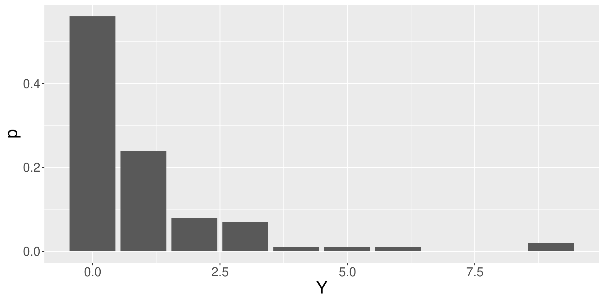 For a discrete random variable \(Y\) taking values \(y_1, y_2, ...\), the expectation of \(Y\) is defined (when the series converges): \[ \mathbb{E}(Y) = \sum_i y_i \mathbb{P}(Y=y_i)\]